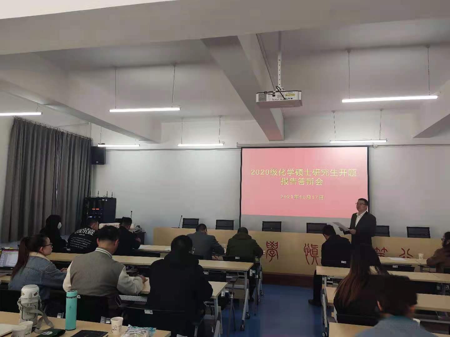 10月17日上午8点,化学与化工学院研究生开题报告暨中期考核报告会在明达楼学术报告厅召开。报告会由学院副院长解海主持,研究生工作部副部长张继红、招生与就业科科长昝智超、教学管理与培养办公室高娜参加了报告会,学科点带头人冯锋教授、硕士生导师、研究生秘书、2019级、2020级、2021级研究生参加了本次报告会。